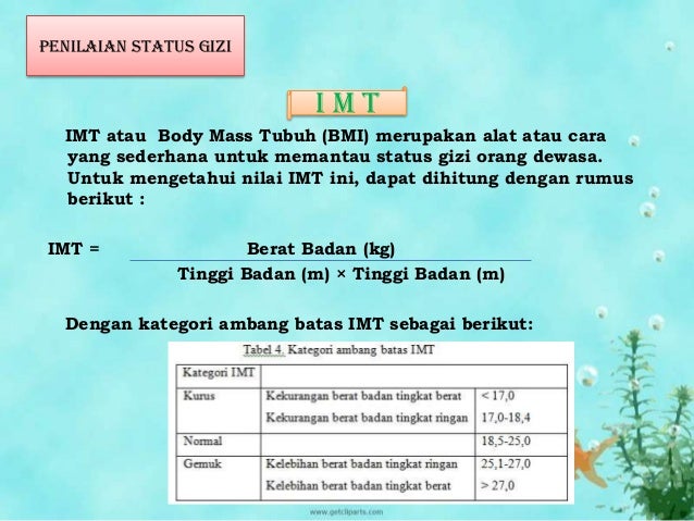 penilaian status gizi.ppt - Penilaian Status Gizi ... from www.coursehero.com Imt merupakan alat sederhana untuk memantau status gizi orang dewasa khususnya yang berkaitan dengan kekurangan dan kelebihan berat badan, maka mempertahankan berat badan normal memungkinkan seseorang dapat mencapai usia harapan hidup yang lebih panjang. Survei konsumsi, statistik vital dan faktor ekologi. Modifikasi moehyi (1992), supariasa (2002), dan ruelly (2007). Selain itu, aplikasi antropometri mencakup berbagai bidang karena dapat dipakai untuk menilai status pertumbuhan, status gizi dan obesitas, identifikasi individu. 2.1.2.3 indeks tinggi badan menurut umur (tb/u) tinggi badan merupakan ukuran antropometri yang menggambarkan pertumbuhan skeletal dalam keadaan normal, tinggi badan tumbuh bersamaan dangan pertambahan umur. Supariasa (2001), batasan anemia adalah sebagai berikut: Adriani, m dan wirjatmadi, b. Oleh supariasa, i dewa nyoman, kee,joyce lefever terbitan: